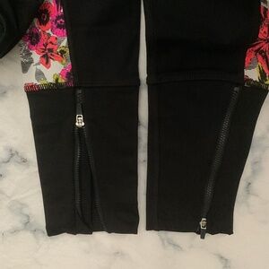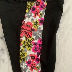 Brand new, never worn without tags! Super unique VS Sport knockout tights with a multicoloured floral pattern. There is an adjustable waistband built in and a discrete pocket in the back of the waist that could hold keys, cards, or change. They are made with performance fabric with four way stretch and are full length tights. The bottom of each leg has a zipper that is fully functional and can be adjusted to your preference.