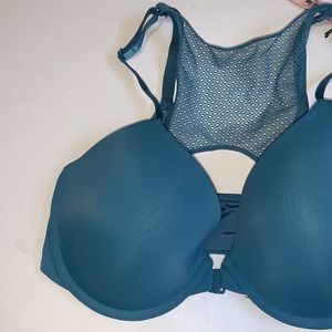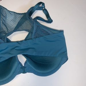 New with tags Victoria’s Secret lightly lined teal blue underwire demi t-shirt bra with mesh lace back in women’s size thirty two double D ( 32DD / DD32 ).