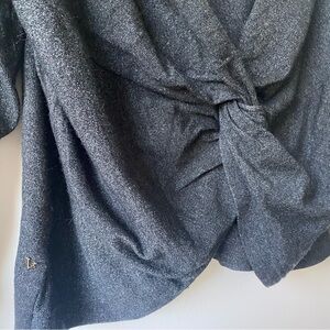 Very soft material. The tie knot is supposed to be worn on the back. Big V opening. Gathered cuffs.