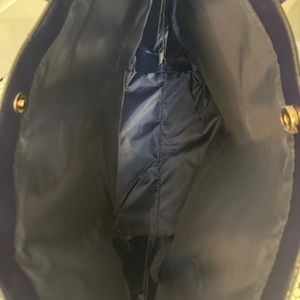 Gorgeous white, blue and shades of lavender floral motif. Gold hardware. Front extra pocket. Faux leather handles. Interior fabric lining. Gold magnetic clasp closure.