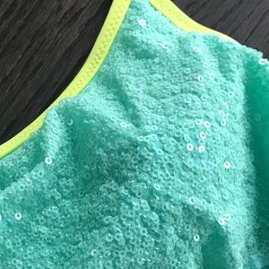 Victorias Secret Flounce Style Bikini Top Turquoise Blue with Sequins and Neon Green Trim. Size Small. TOP ONLY.