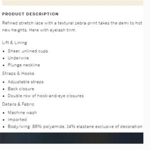 Refined stretch lace with a textural zebra print takes the demi to hot new heights. Here with eyelash trim.