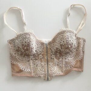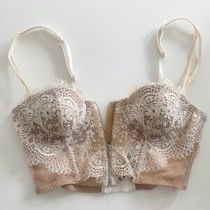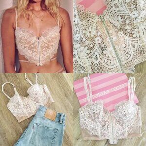 • Vintage "V.S. Very Sexy" Embroidered Crochet Lace Sheer Mesh Zip-up Demi Lined Bustier Bra Top