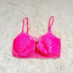 This Victoria’s Secret Very Sexy lined balconette, Size 32D, blends several high‑demand lingerie trends—Barbiecore, coquette aesthetic, romantic feminine, boudoir glam, and VS bombshell style. The bright hot‑pink lace creates a bold, ultra‑feminine look, while the balconette cut offers a flattering, lifted shape with structured lined cups for added support.