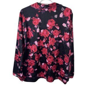 A Victoria's Secret satin pajama shirt featuring a black background with a red rose floral print. It is a button-down top with a classic collar and long sleeves. The shirt includes a chest pocket and white buttons down the front. The garment is made of satin fabric, giving it a smooth and luxurious appearance. The dominant feature is the vibrant red rose print scattered across the black background, providing a striking contrast.