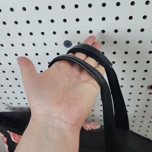Zipper closure along top and one zipper pocket inside also. Black pleather strap apex.