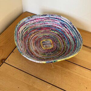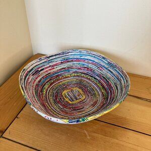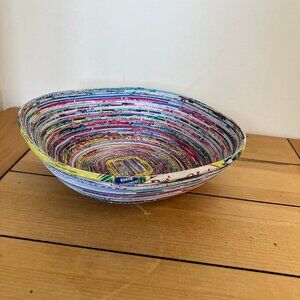 Hand made decorative bowl was made in Vietnam using folded magazine pages, creating a colorful layered stripe pattern. Approx. 9" across top edge x 2 3/4" deep. Decorative use only - do not immerse in water. Pre-owned condition: light surface wear from display.