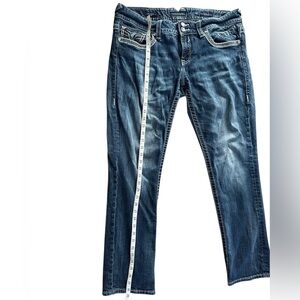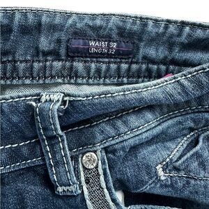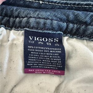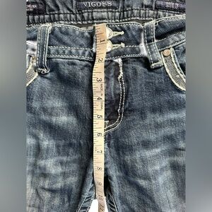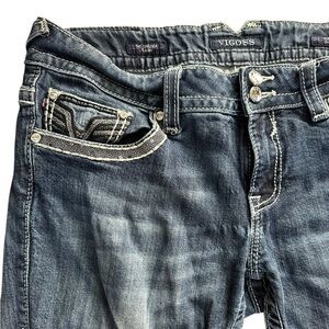 Classic and comfortable Vigoss Chelsea Straight jeans with that signature embellished look! These feature rhinestone and embroidered detailing on the front coin pocket and bold “V” stitching on the back pockets.