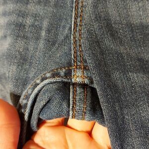 A distressed spot on one pocket. Looks possibly factory (photographed) but otherwise very light signs of wear.