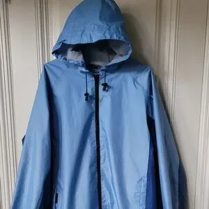 Viking, EUC, Size XL, two toned blue nylon jacket, with attached adjustable drawstring hood, velcro closure front pockets and elasticized cuffs per pics. Great layering piece!!
