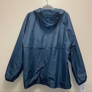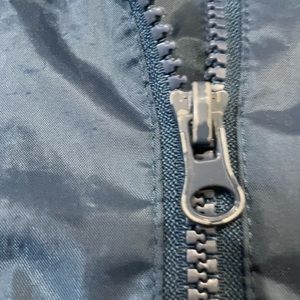 Zips up the front, has 2 front pockets and a hood with drawstring to tighten and tie it closed
