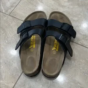 Comfortable black men's slide sandals with dual adjustable buckles. Contoured footbed offers all-day support and a secure fit. Durable synthetic straps and cushioned sole for everyday wear. Classic black styling pairs easily with casual outfits.