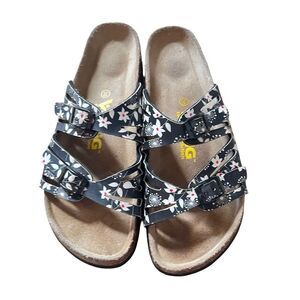 Viking Black White Floral Two Strap Cork Birkenstock Style Sandal
