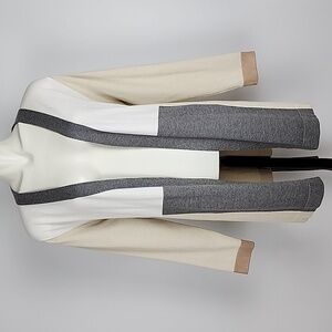 Excellent pre-owned condition, Vila Milano open front belted long cardigan with geometric designs of beige, grey and white, size large.