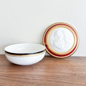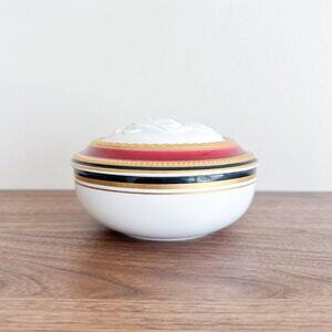 Stunning Villeroy & Boch trinket box from their 250th anniversary "Vaudrevange" collection (1998). Elegant raised cameo on the lid, finished in regal gold, crimson, and black banding. Perfect for vanity styling or jewelry storage. Flawless condition.