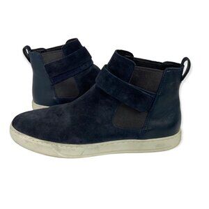 Vince Belmont Suede High-Top Sneakers in Navy Blue and Mens Size 11 (or EU Size 45). Retails for $498. Italian and calf suede and leather; elastic gore inset for fit. Grip-strap upper. Back pull loop. Rubber sole. Very good pre-loved condition. Minor wear but no flaws. See photos for details.