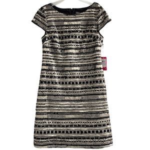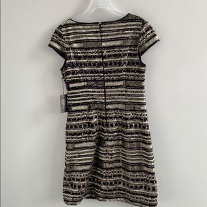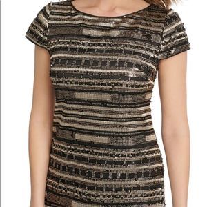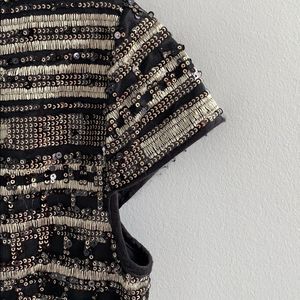A cocktail dress steps up its shine with the addition of a geometric stripes done in a mix of dazzling beads.