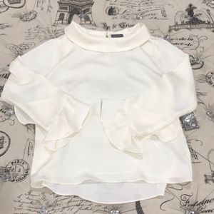 Ruffle sleeves add movement to this blouse by Vince Camuto that features a mock neck and and a keyhole detail at the back.