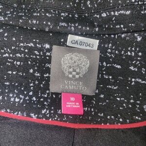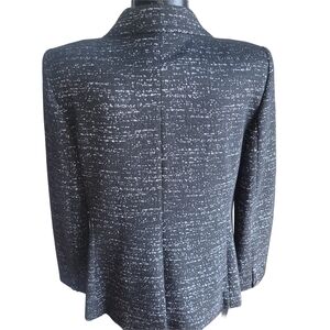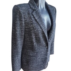 Elevate your style with this chic black blazer with white speckled pattern. Perfect for any occasion, this jacket offers a sophisticated look with its classic design. Ideal for pairing with both casual and formal outfits. Has 1 button front closure and 2 front slot pockets.