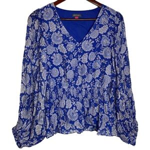 Vince Camuto Blue Gray Floral Print Smocked Waist Balloon Sleeve Peplum Small