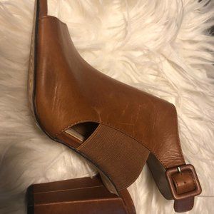 Never been worn, distressed leather. Upper & lining is real leather. Chunky heel, very comfortable, wide open toe.