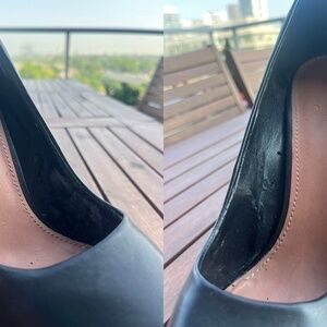 Sleek black platform pumps! Featuring a closed round toe, high stiletto heel, and subtle pleated detail at the heel, they're perfect for a night out or a polished office look. Great condition on the outside with some peeling on the inside (shown in the image).