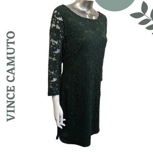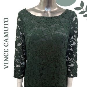 Turn heads at any occasion with this Vince Camuto dark green lace sheath dress. Featuring delicate floral lace, sheer 3/4 sleeves, and a flattering silhouette, it’s perfect for holiday parties, evening events, or semi-formal gatherings. The back zipper adds function while maintaining the sophisticated style.