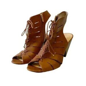 Vince Camuto Estie Leather Ankle Booties Peep Toe Heeled Lace Up Tan Brown 10