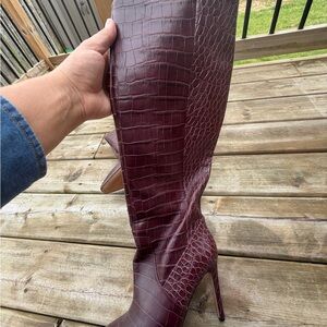 Stylish knee-high boots with a crocodile pattern. Rich brown color adds elegance. Perfect for a chic look.