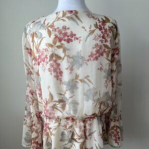 🤍Vince Camuto Flutter Cuff Peplum Blouse Sz L* Floral- Cream -burgundy