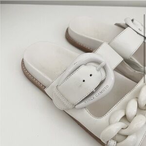 Turn heads of your fellow fashionista's with this Vince Camuto sandal with oversized chainlink hardware on a footbed sandal.