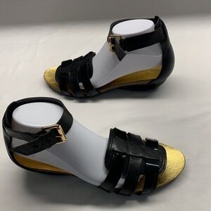 Features: open toe sandal / adjustable ankle strap / gold metallic insole with cork / sculptured heel / leather upper