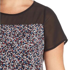 Sheer chiffon at the yokes, sleeves and hem adds a flirtatious twist and trendy mixed-media design to a knit top patterned in a color-popped mosaic print.