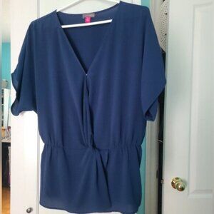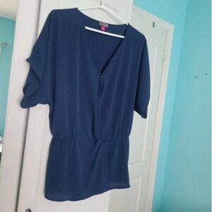 Vince Camuto Navy Royal Dark Blue Flutter Short Sleeve Waist V-Neck Top Blouse