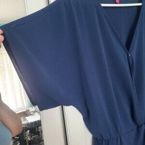 Vince Camuto Navy Royal Dark Blue Flutter Short Sleeve Cinch Waist Peplum Style V-Neck Top Blouse Open