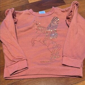 This charming pink sweater showcases a whimsical unicorn graphic made from a shimmery material that adds a magical flair. The long sleeves feature delightful gathers at the shoulders, enhancing its playful style. Ideal for casual outings, this top is sure to bring joy with its enchanting design.