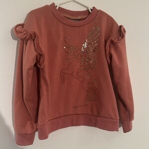 This charming pink sweater showcases a whimsical unicorn graphic made from a shimmery material that adds a magical flair. The long sleeves feature delightful gathers at the shoulders, enhancing its playful style. Ideal for casual outings, this top is sure to bring joy with its enchanting design.