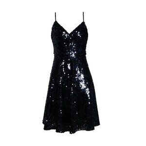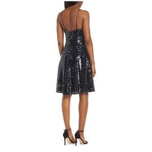 Shimmering sequins light up this party-ready frock styled with a strappy V-neck bodice, a fitted waist and twirl-worthy skirt.