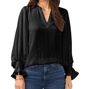 Rich texture and flowy, ruffled sleeves bring lovely flow to a versatile split-neckline top from Vince Camuto.
