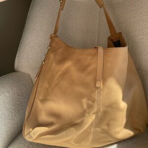 Chic Vince Camuto shoulder bag in tan leather. Features gold-tone accents. Perfect for versatile styling.