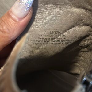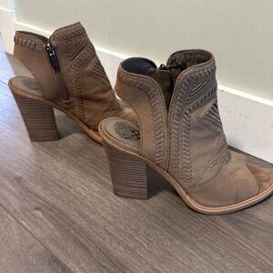 Stylish tan peep-toe booties with intricate stitching. Features a side zipper for easy wear.