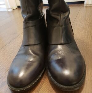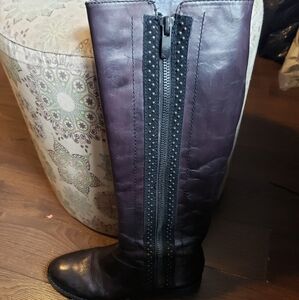 Preowned leather tall boots with side zippers. This boot looks black but is not, the last two photos shows the through color of the boot. Normal signs of wear from every day wear but in great condition.