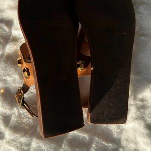 Style: Dailette, Colour Canyon Brown, Toe loop, hexagon-shaped metal stud detail, sling back style, adjustable buckle closure.