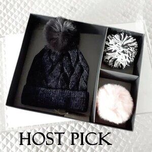 NWT Vince Camuto “pom-pom of the day” faux fur pom pom black beanie and 3 interchangeable poms box set