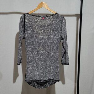 Vince Camuto clingy blouse. Black and silvery white wiggly line pattern. 3/4 length sleeves. Pull over. Ruched neckline and body. Unlined. There are not any buttons or zippers. 95% polyester and 5% spandex. Stretchy! It is marked a size small. There are not any stains, tears, or holes. Very good, gently used condition.