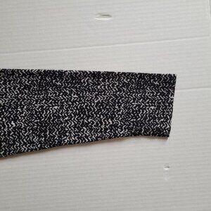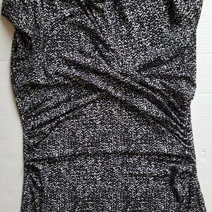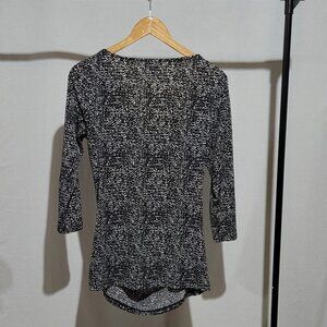 Vince Camuto clingy blouse. Black and silvery white wiggly line pattern. 3/4 length sleeves. Pull over. Ruched neckline and body. Unlined. There are not any buttons or zippers. 95% polyester and 5% spandex. Stretchy! It is marked a size small. There are not any stains, tears, or holes. Very good, gently used condition.