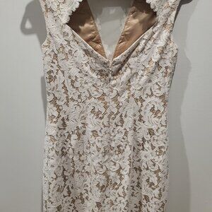 Lace dress hits slightly above the knee. Partially open back. Off white with tan lining.