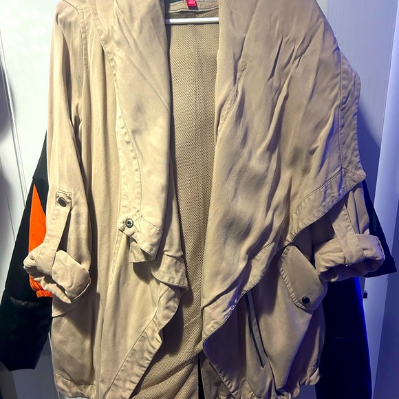 Stylish Vince Camuto draped lightweight jacket in a neutral beige tone. Features a relaxed open front design, roll-tab sleeves, and adjustable drawstring hem for a customizable fit. Perfect for layering in any season. Size XS Excellent condition, gently worn.