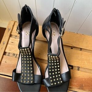 Beautiful Vince Camuto leather 3” heels with gold studs front and centre. With double logo buckled strap around ankle and back zippered entrance, you will have great support in these comfortable heels. **Please note the photos, minor heel scuff.** These heels will be a stunning addition to your wardrobe.