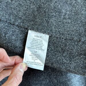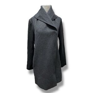 This Vince coat showcases a chic gray and black design, featuring a prominent asymmetrical collar and a wrap-style closure. Made from a luxurious wool-blend fabric, it offers a relaxed fit with full-length sleeves, perfect for elevating your outerwear collection.